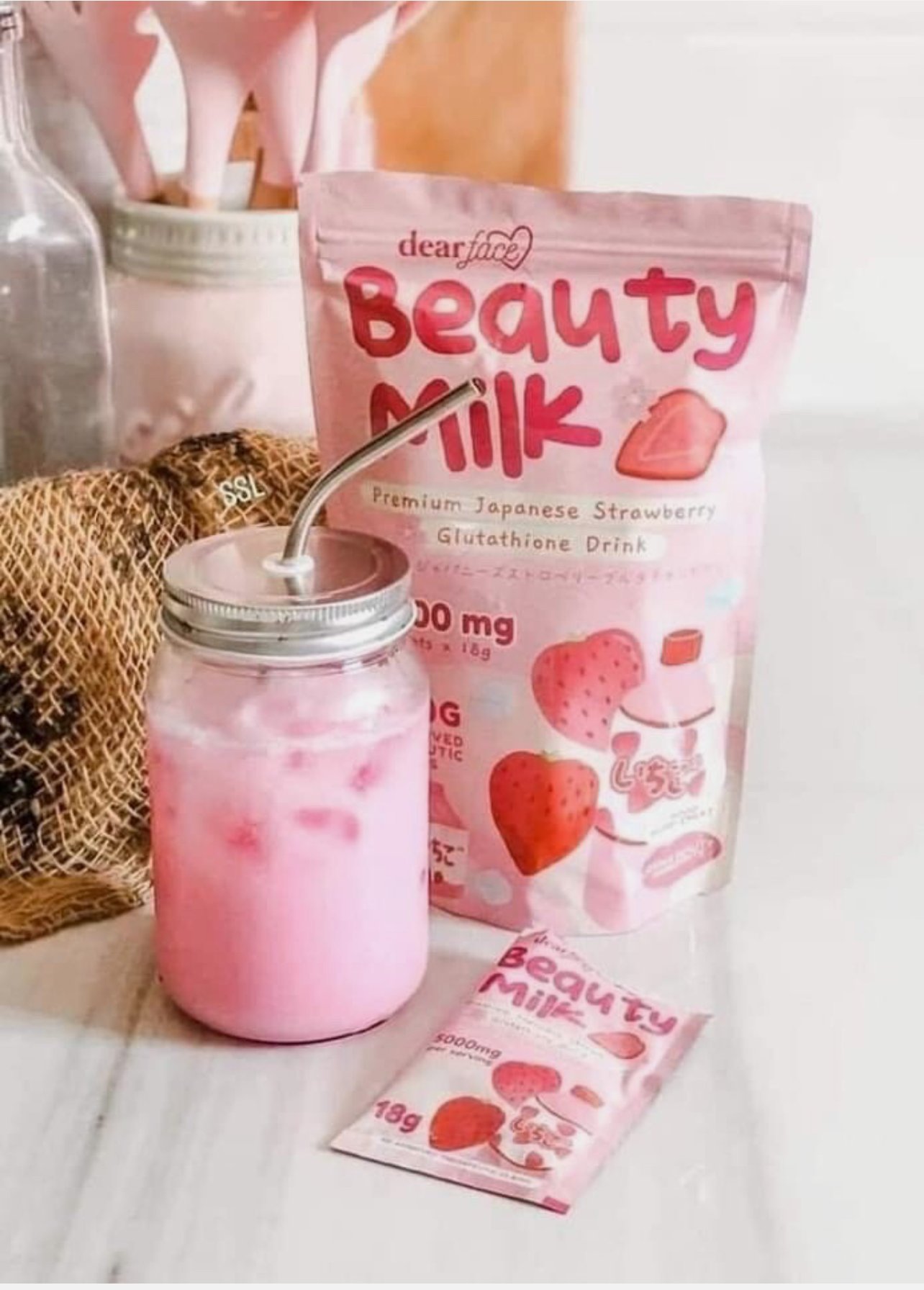 Dear Face Beauty Milk Premium Japanese Strawberry Glutathione Drink Dietary Supplement 180g (10 Sachets × 10g)
