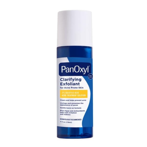 Clear acne and unclog pores with PanOxyl Clarifying Exfoliant 2% Salicylic Acid. Skin can become dry and lackluster when dead skin cells build up on the surface. Salicylic Acid, a Beta Hydroxy Acid (BHA), helps to dissolve dead skin and minimize the production of certain skin oils. Regular exfoliation removes the oil buildup, leading to a smoother, clearer and breakout-free complexion. This gentle leave-on exfoliating treatment contains the highest concentration of Salicylic Acid available over the counter. The super lightweight, clear formula also includes Blue Algae and Antioxidants that help to calm irritation and redness, often associated with acne. This pH-balanced, dermatologist recommended treatment is great for all skin types, especially oily, sensitive and acne-prone skin.